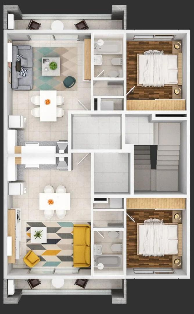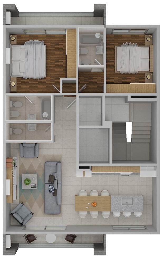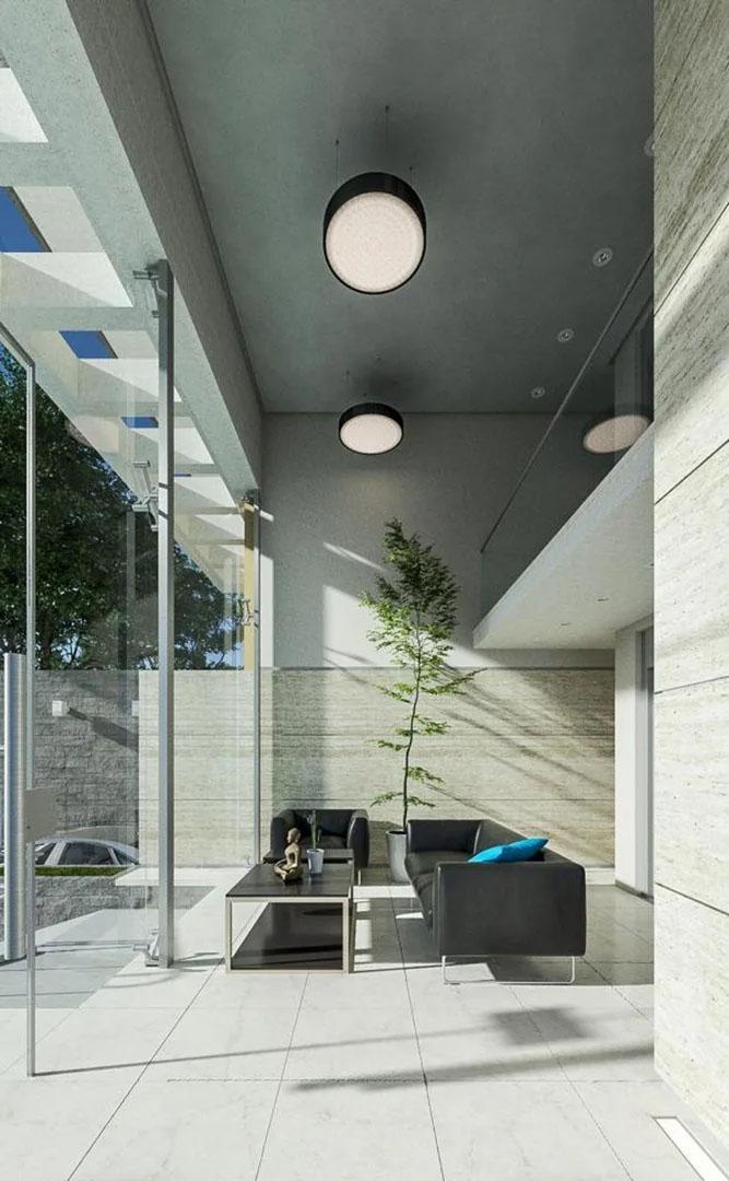 Los departamentos constan de living comedor con pisos de porcelanato, cocina integrada con muebles de altos y bajo mesada con encimera de mármol, horno eléctrico con anafe, espacio para lavarropas. Baño con receptáculo de ducha y con artefactos Ferrum o Roca o similar. Dormitorio con pisos de madera flotante de alto tránsito y placard. Instalación para aire acondicionado en todos los ambientes.